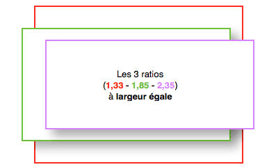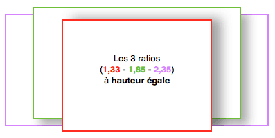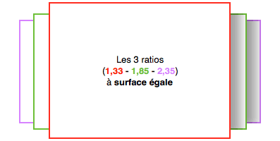 Représentations comparées de 3 ratios (1,33 - 1,85 - 2,35) à hauteur égale ; à largeur égale ; à surface égale.