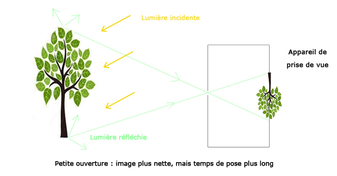 • Plus l’ouverture est petite : plus la netteté est grande, mais plus la quantité de lumière qui arrive sur la surface sensible est faible et nécessite donc un temps de pose plus long.