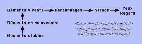 Les études sur les mouvements oculaires et le cheminement du regard devant une photographie, nous montrent que le sujet “accroche“ son regard sur certains points qui lui paraissent particulièrement importants (visage, yeux, couleurs,..) sautant ainsi d'un détail à un autre.
