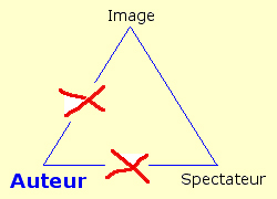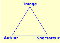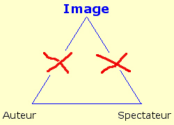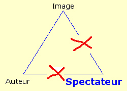 Une représentation sous forme de triangle nous semble une différence essentielle, dans la mesure où nous pouvons ainsi faire ressortir une liaison entre auteur et spectateur nous permettant de signifier qu'il existe entre ces deux pôles des relations qui ne passent pas obligatoirement par le "message".